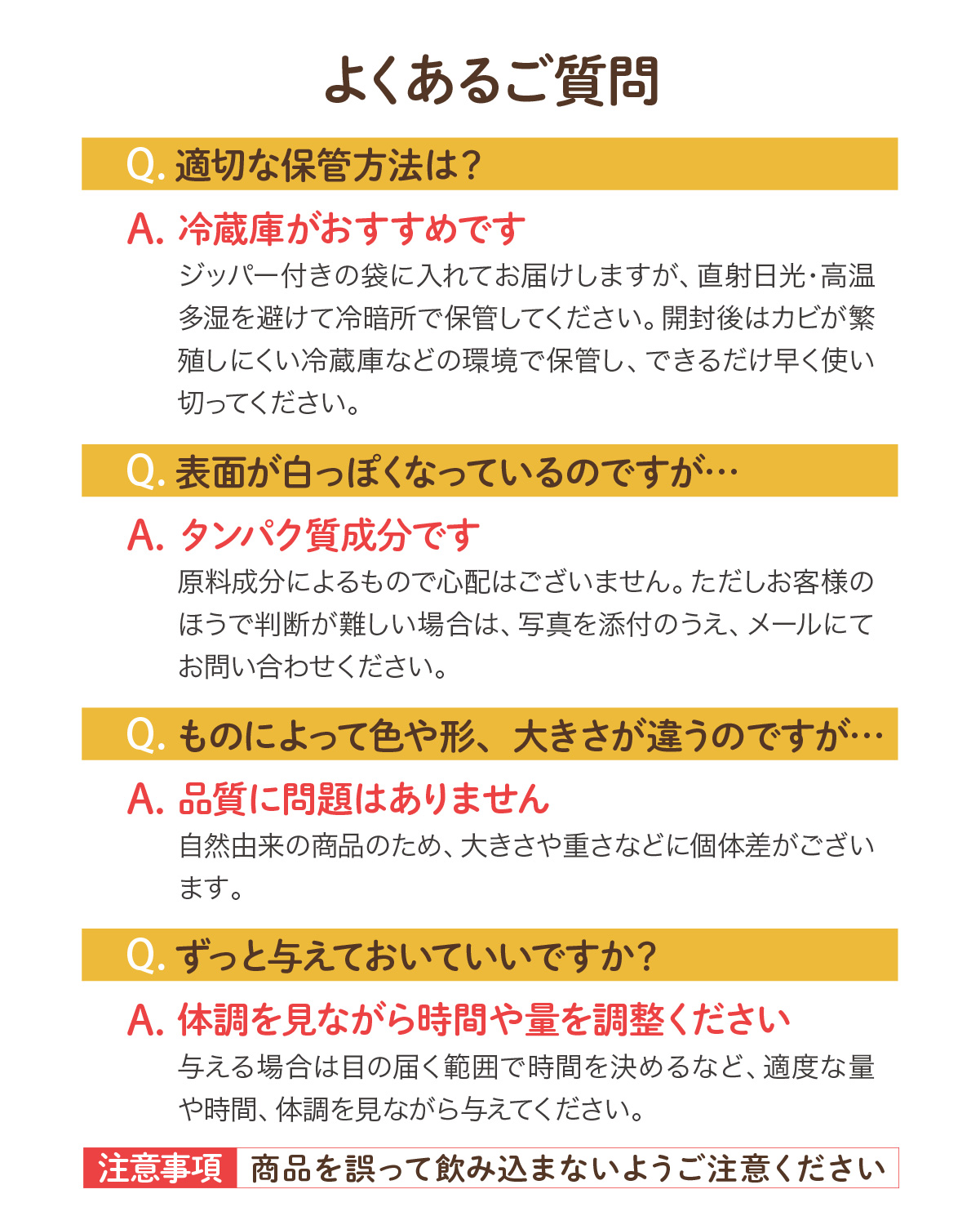 ※噛まずに飲み込んでしまう場合は、喉に詰める危険性があります。手で持ちながら与え、それでも丸呑みしてしまう場合は、中止してください。